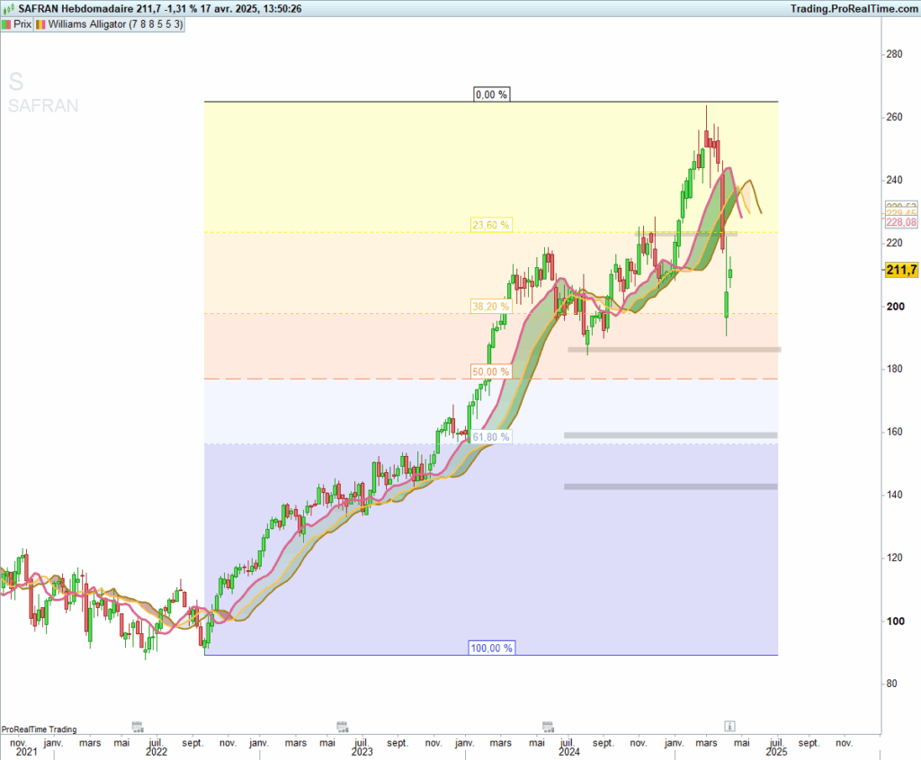 Le graphique représente l’évolution du cours de l’action SAFRAN sur une base hebdomadaire, accompagné des retracements de Fibonacci et de l’indicateur Williams Alligator.
