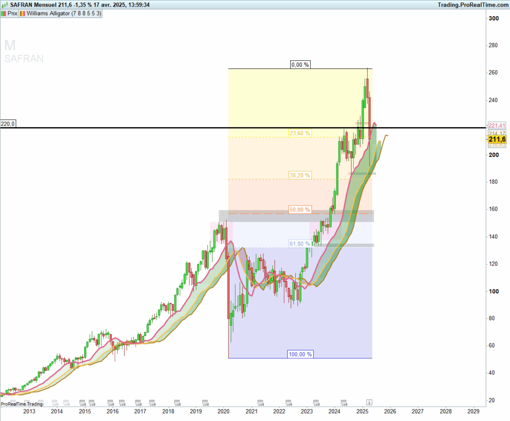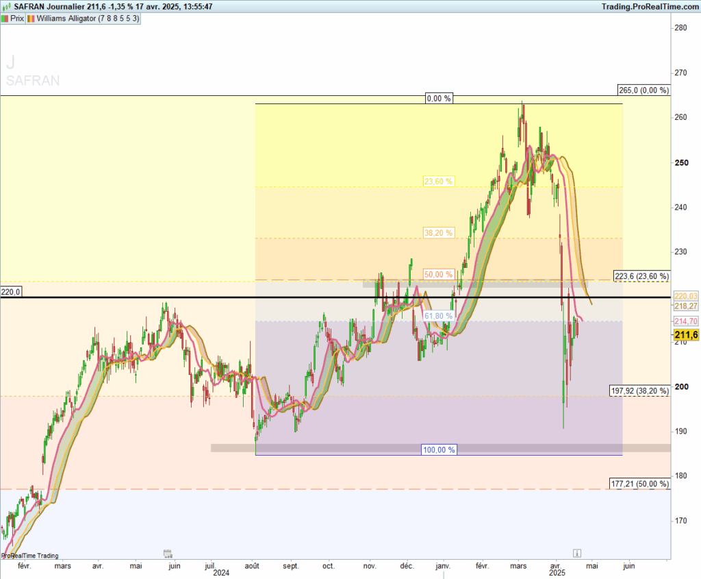 Après avoir atteint un sommet proche des 265 €, le titre SAFRAN a entamé une correction marquée. Le cours a récemment cassé la moyenne mobile inférieure de l’indicateur Alligator, signalant un possible retournement de tendance à moyen terme. La baisse s’est arrêtée temporairement près du niveau de retracement de 38,2 %, situé autour des 205 €, ce qui pourrait jouer un rôle de support intermédiaire.