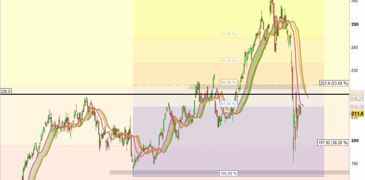 Le prochain niveau de support majeur se situe vers le niveau de 50 % de Fibonacci, autour des 185 €, en cas de poursuite du repli. Une stabilisation au-dessus de 200 € pourrait toutefois relancer un mouvement haussier, mais la dynamique semble affaiblie depuis le début de 2025.