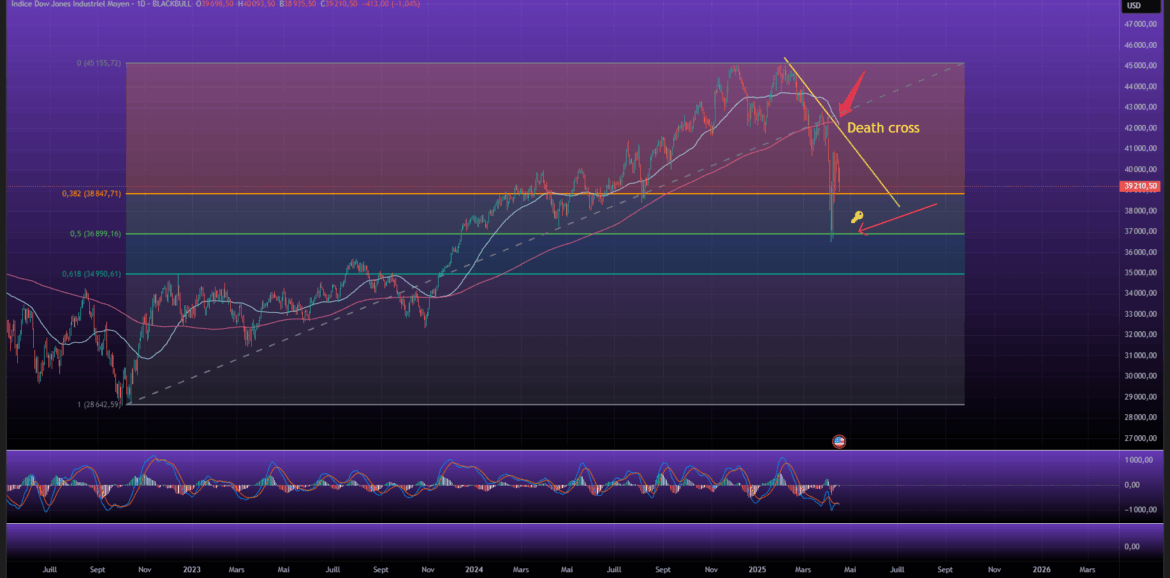Le graphique quotidien du Dow Jones montre une nette dégradation de la tendance depuis son sommet à environ 45 000 points. On note un “Death Cross”, signal baissier fort, où la moyenne mobile courte croise la moyenne longue à la baisse. Cette configuration accentue le risque d’un retournement prolongé du marché.