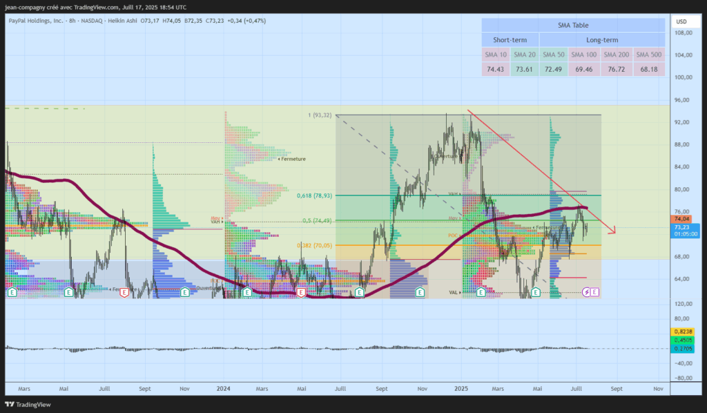 La moyenne mobile 200 périodes (MM200), affichée sur le graphique autour de 76,72 USD, joue actuellement un rôle de barrière technique majeure pour l’action PayPal. Après la phase de rebond observée début 2024, le titre a buté plusieurs fois sur cette résistance dynamique de long terme, ce qui confirme la pression vendeuse active sur ce seuil.