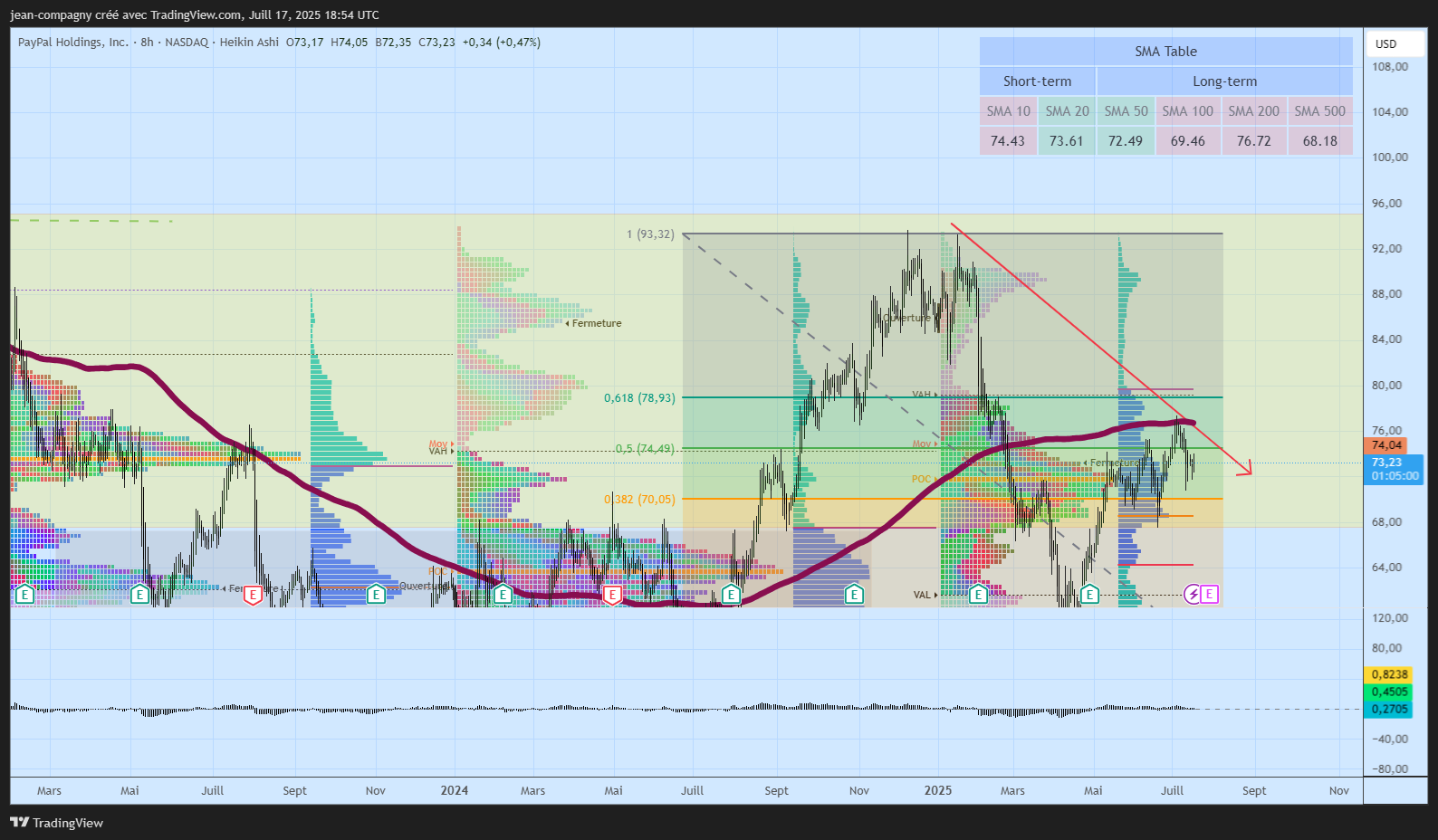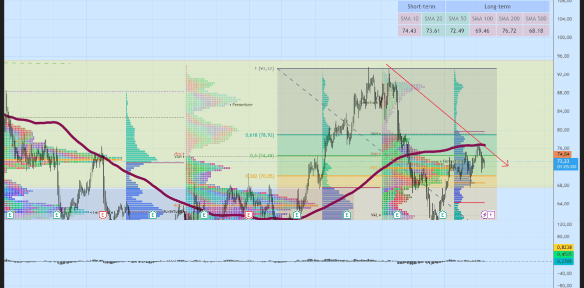 Depuis ce point haut, le graphique montre une correction significative marquée par une tendance baissière (flèche rouge), ramenant le cours dans une zone comprise entre 70 et 80 USD. Les volumes par prix (VPVR) révèlent des zones de support et résistance majeures, notamment autour des niveaux 74,44 USD (SMA 10), 73,61 USD (SMA 20), et la zone des 74,49 USD (retracement de Fibonacci 0,5), qui correspondent à des convergences de moyennes mobiles et de flux de volume importants.