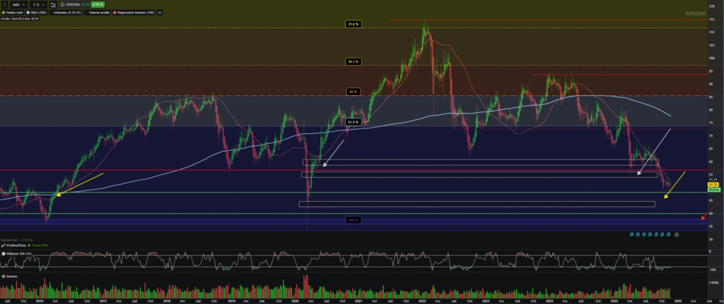 ⚠️ Un rebond n’est possible qu’au-dessus de 55–58 €, sinon la chute continue.