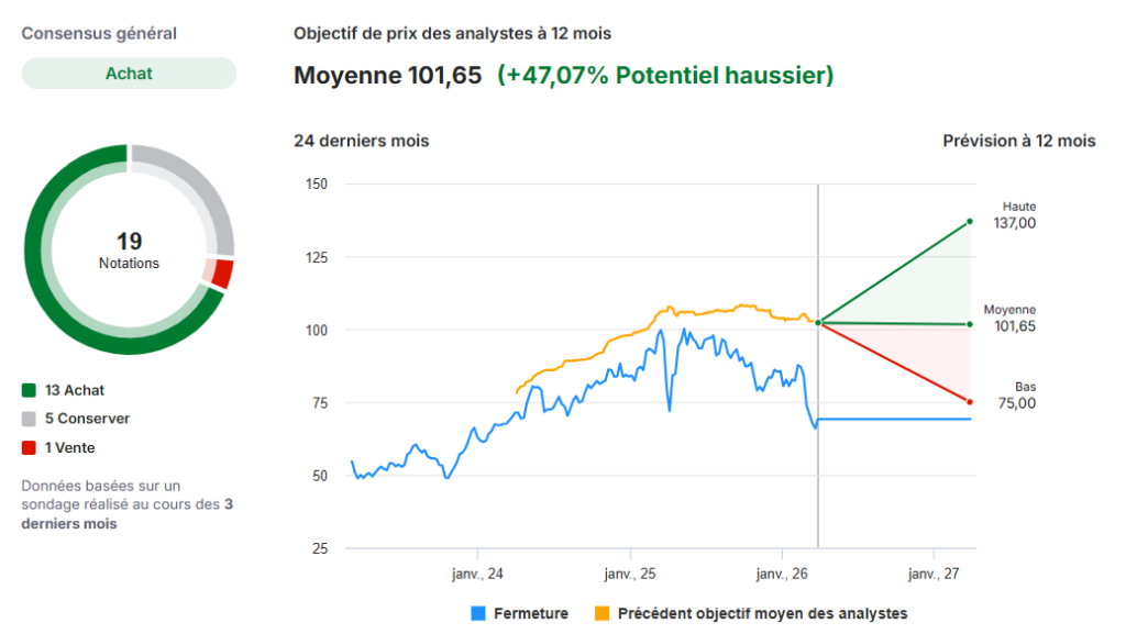 • Objectifs analystes : Prix cible moyen : 101,65 €, soit +44,7 % de potentiel, 19 analystes impliqués, recommandation « Achat fort ».
